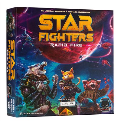Star Fighters Rapid Fire Star Fighters: Rapid Fire combines the excitement of real-time dice rolling with tactical starship combat. Each player hops into the cockpit of their own starfighter and duels it out in a dog fight to prove who is the superior pilot. The game plays in multiple modes 1 vs 1, 3 player free-for-all, 2 vs 2, or a solo mode where a single starfighter attacks an orbital space station. In the real-time phase all players roll and re-roll their command dice simultaneously, and assign them to the various functions of their starfighter. When a player has fully charged systems and is ready to act they may end the real-time phase by hitting the big red button and yelling, “Fire!” This means all players must cease rolling and allocating dice and move to the tactical phase. In the tactical phase players then alternate activating the systems they have charged. This allows them to fire torpedoes or lasers at the enemy, manoeuvre around the map, adjust their shields, and other actions unique to their chosen starfighter. Players must balance the pressure of real-time play while making good tactical and strategic decisions. The game only ends when one starfighter is destroyed. The pilot that hits the finishing blow gets all the glory and is the winner. Contents: 1 rulebook 1 star map board 4 double-sided player boards 4 star fighter miniatures 36 custom dice 50 acrylic shield cubes 8 torpedo tokens 20 hull damage tokens 12 shield generator tokens Solo mode: 1 starbase board 1 starbase token 5 starbase hull damage tokens 19 solo cards