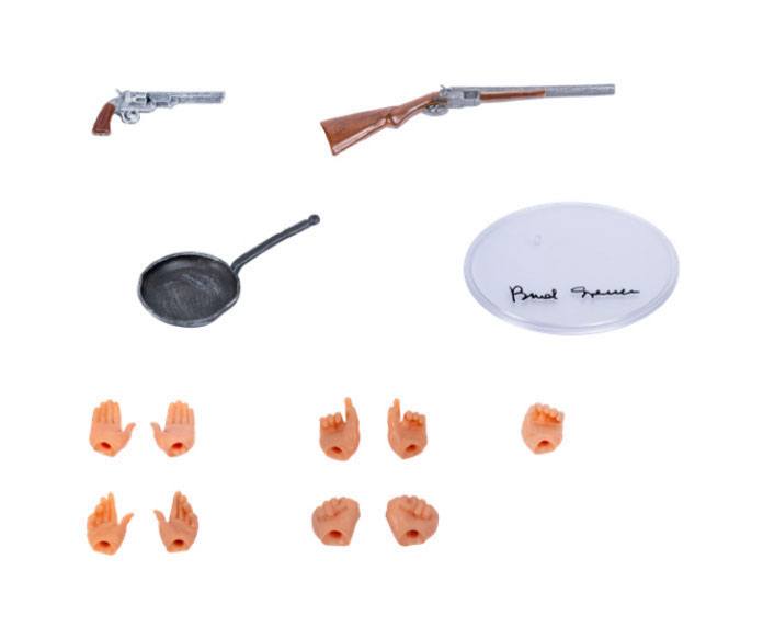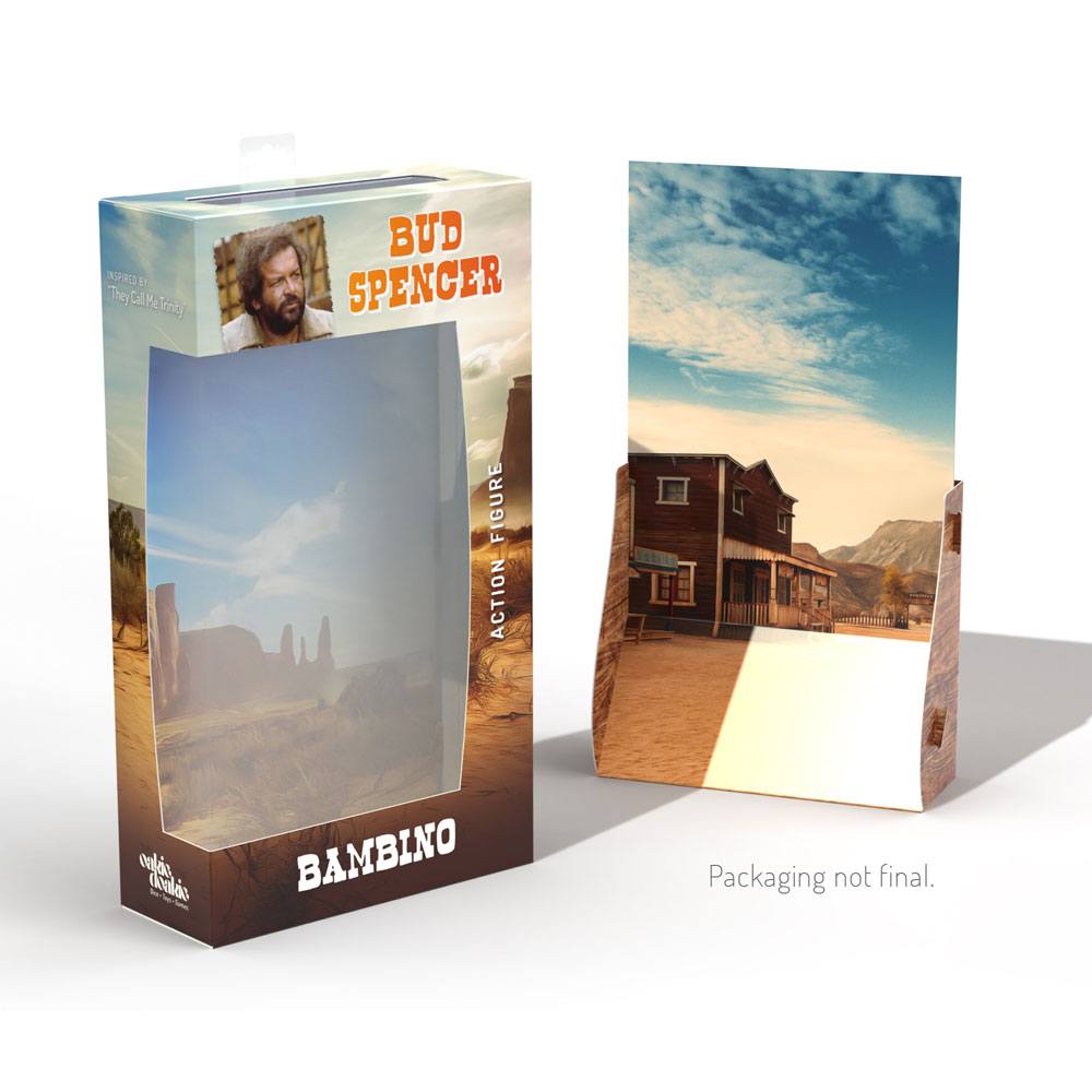 Den mest legendariska europeiska skärmduon är tillbaka i aktion! Oakie Doakie Toys presenterar stolt de ivrigt väntade första actionfigurerna i det populära 7-tums formatet av Bud Spencer och Terence Hill (säljs separat). Bud Spencers officiellt licensierade actionfigur inspirerades av hans roll som Bambino från den klassiska filmen "They Call Me Trinity". Denna 18 cm höga figur har 14 artikuleringspunkter och levereras med ytterligare tillbehör i en fönsterlåda med hängare. En transparent bas med en tryckt signatur håller Bambino till ett säkert stativ med en reversibel, dubbelsidig diorama som säkerställer en tilltalande presentation av figuren, antingen framför en öken eller västra stadsbakgrund. Bambino levereras med följande tillbehör: - 9 ersättningshänder - Rifle - Pistol - Cartridge Belt med hölster - Stekpanna - Transparent bas med tryckt Bud Spencer -signatur - Reversibel Diorama gjord av kartong
